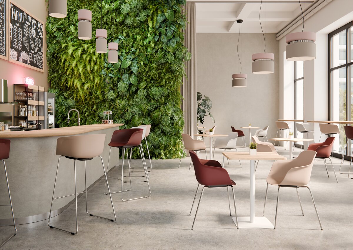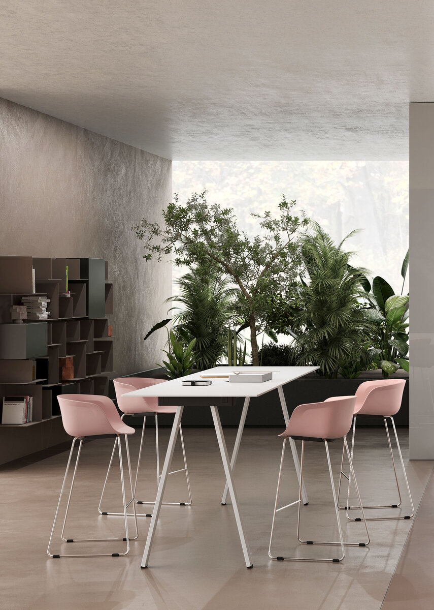Pour aménager vos espaces de pause et de cafétéria, la version fixe 4 pieds en métal, assortie du tabouret piétement traineau est idéale. En solo ou duo autour d’une table ou d’un bar, Loria vous accompagne confortablement pendant vos pauses déjeuner